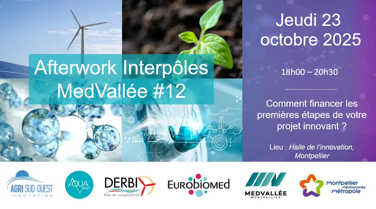 Les pôles de compétitivité DERBI, AGRI SUD-OUEST Innovation, AQUA-VALLEY et EUROBIOMED, partenaires de MedVallée, vous invitent à la 12ème édition des Afterworks Interpôles MedVallée le jeudi 23 octobre 2025 à 18h à la Halle de l’Innovation de Montpellier.