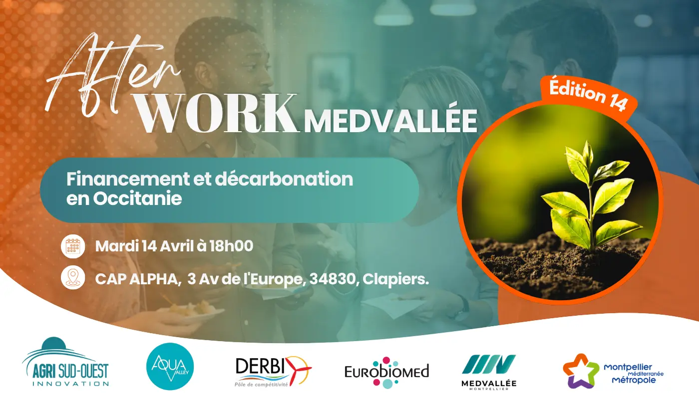 Nous avons le plaisir de vous inviter pour la 14e édition d’Afterwork MedVallée, co organisé par les pôles de compétitivité Agri Sud-Ouest Innovation, DERBI-CEMATER, Aqua Valley et Eurobiomed. Cet afterwork dédié aux enseignements de l’étude EDF sur la décarbonation en Occitanie et aux leviers de financement bas carbone avec Ayming.