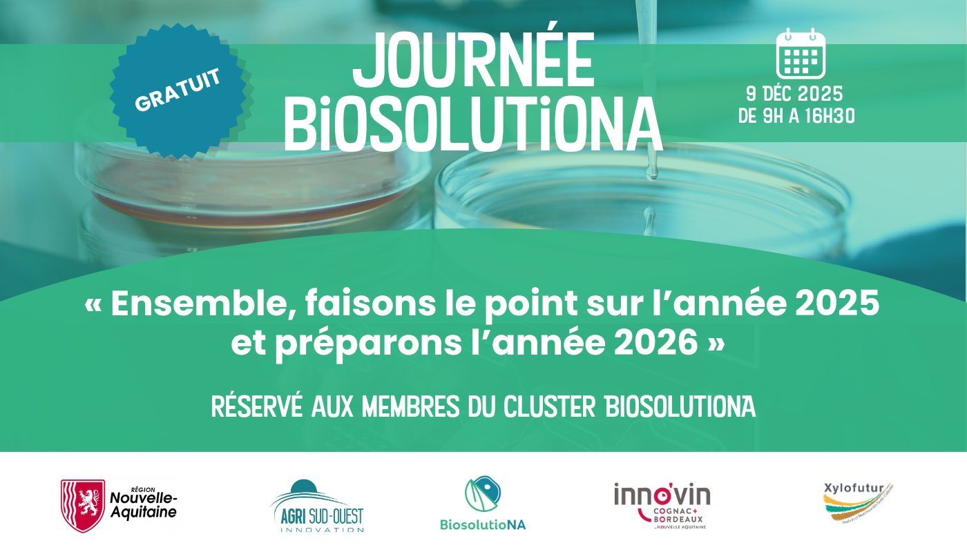 Journée BiosolutioNA : Ensemble clôturons l’année 2025 ! En partenariat avec Xylofutur et Innovin, Agri Sud-Ouest Innovation vous donne rendez-vous le mardi 9 décembre 2025 de 9h à 16h30 à Bordeaux.
