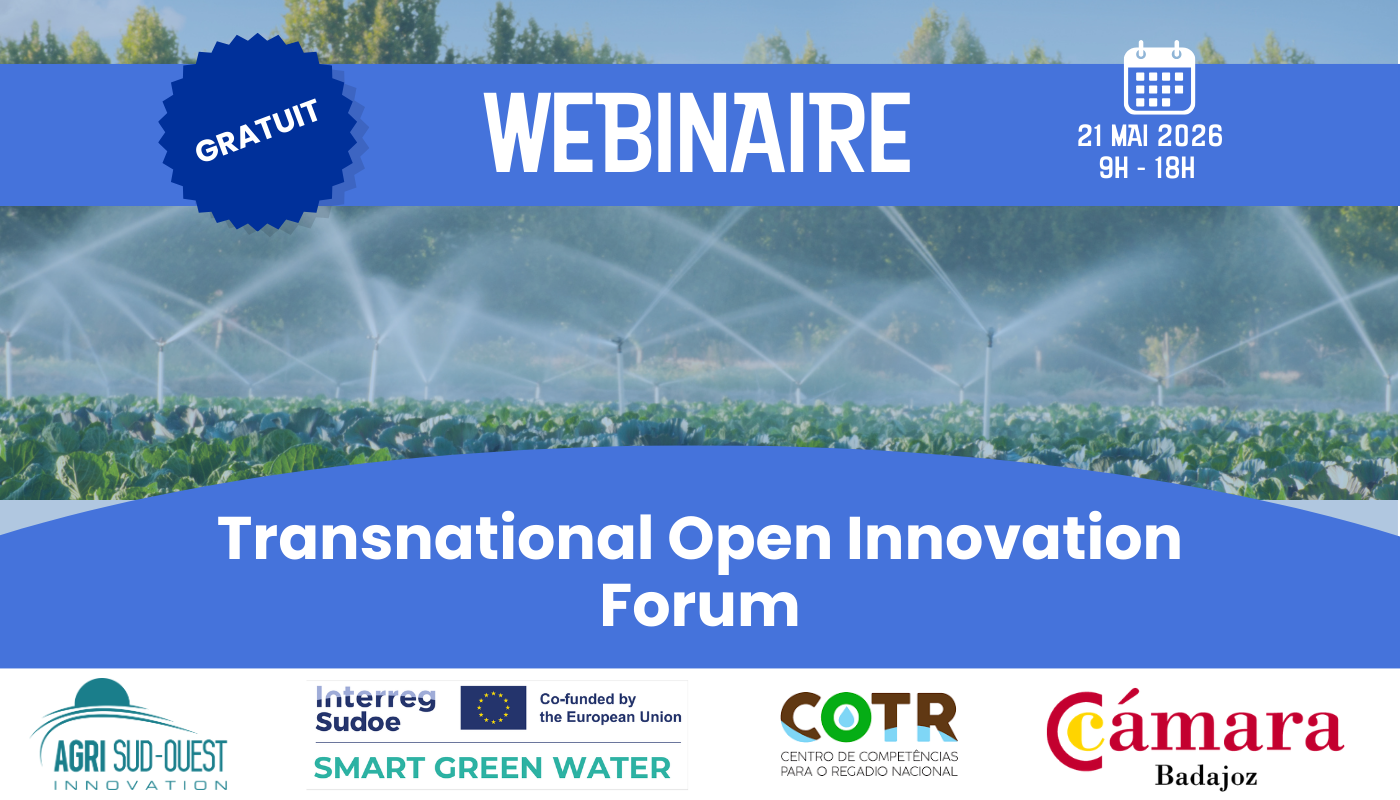 Nous avons le plaisir de vous convier à un webinaire organisé dans le cadre du projet européen Smart Green Water, consacré à l’irrigation, aux solutions numériques et aux innovations développées en France, en Espagne et au Portugal.